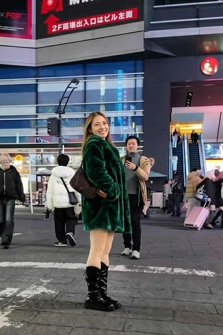 The image depicts an urban pedestrian area at night in Gifu, Japan. A light-skinned female individual with long light-brown hair stands center-left, smiling towards the camera. She wears a dark green faux fur coat, a short light-colored garment exposing her upper thighs, and tall, shiny black boots. A dark-patterned handbag is slung over her right shoulder. Behind her, to the right, a male individual of East Asian descent, wearing a beige jacket over a grey turtleneck, holds a smartphone up, appearing to film the female subject. The background features modern multi-story buildings with glass facades and illuminated signage. A prominent digital sign at the top center displays Japanese text, including "2F階増出口はビル左側" (2nd-floor extension exit is on the left side of the building), along with a red circular graphic. To the far left, an older male in a black jacket walks away from the camera. Another individual in a white hooded puffer jacket and black pants walks away in the midground-left. To the right, a group of people is visible near escalators leading into a building, with one person pulling a pink rolling suitcase. The pavement is paved with light-colored blocks and shows patches of reflectivity, possibly from moisture. Artificial lighting from the surrounding buildings and signs illuminates the scene.