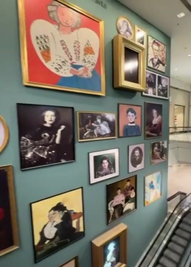 The camera pans up a wall covered in framed paintings and photographs of people, displayed above a set of escalators in what appears to be a commercial building or mall