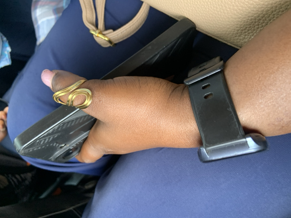 The scene captures a close-up of a person's right hand and forearm, characterized by dark skin. A gold-toned, abstract, wire-wrapped ring is present on the thumb, which displays pink nail polish. A black smartwatch with a dark strap is worn on the wrist. The hand holds a black smartphone, visible from its rear, featuring a textured case and a partially discernible camera module. The subject's leg, clad in navy blue fabric, is visible beneath the hand. A section of a light brown bag with a gold-colored buckle rests to the right. Blurred elements in the upper background suggest an indoor or vehicle environment. No specific landmarks or contextual details are present to identify a precise location within Abuja, Nigeria.