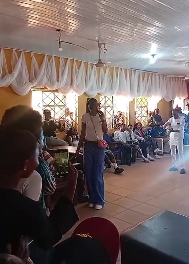 A young woman in a white t-shirt and blue jeans is singing into a microphone in front of a seated audience. A few audience members are recording her with their phones. The room is decorated with white curtains and has a tiled floor. A man in a white outfit is standing to the right of the singer, while another man is walking behind her.