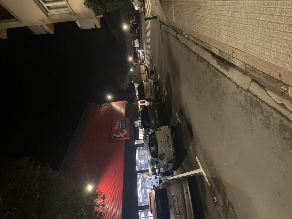 A nighttime view shows an EROSKI center with red siding and a sign. Cars are parked along the side of the building, illuminated by streetlights and store lights. The street and sidewalk run alongside the parking area, with a building visible across the street. The image is somewhat dark, and the focus is mainly on the store and parked vehicles.