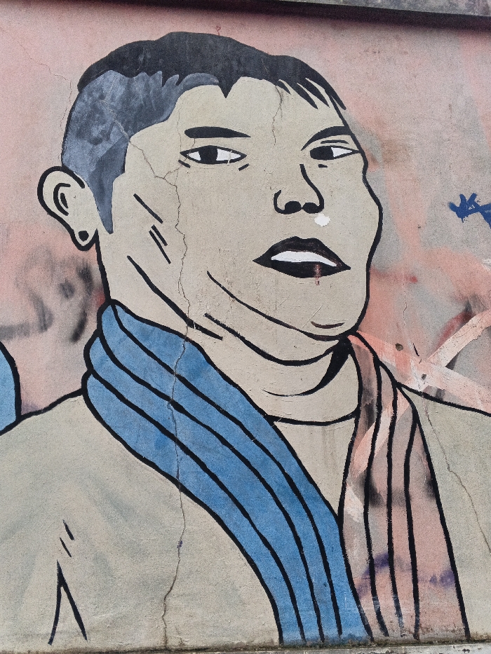 - "A mural depicts a person with gray hair and beige skin against a light pink wall" by FM-cLZC42, licensed under CC BY 4.0