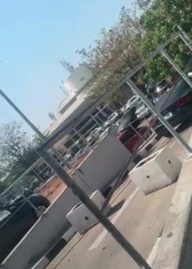 n outdoor scene, seemingly a parking area or entrance to a building. The camera is positioned at a low angle, looking slightly upward. There is a low wall with some concrete planters visible, along with metal railing structures. Several cars are parked in the background, and a large, white building with antennas on top can be seen in the distance. The sky is clear and blue. The shot appears stable, with no camera movement apart from slight adjustments.