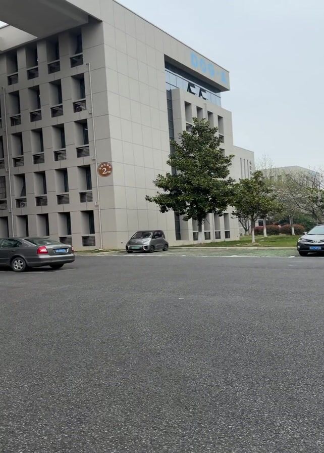 street scene on a cloudy day. A silver car is parked on the side of the road, next to a green median with bushes and trees. A multi-story building is visible on the left, and more trees line the street on the right. A person is walking in the distance on the sidewalk. The road is asphalt.