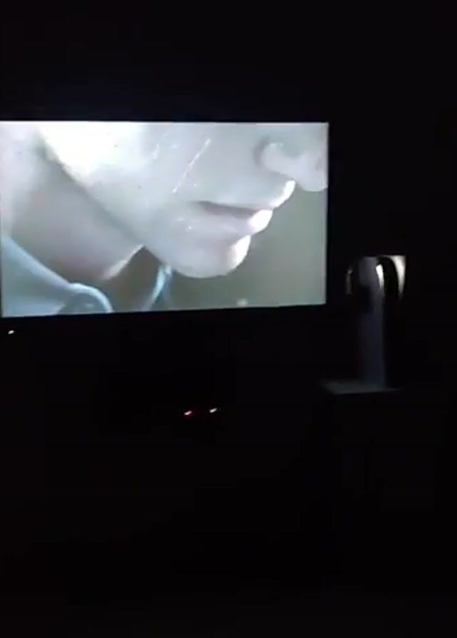 The video depicts a dark room where a television screen displays a close-up shot of a person's face, focusing on their mouth and chin