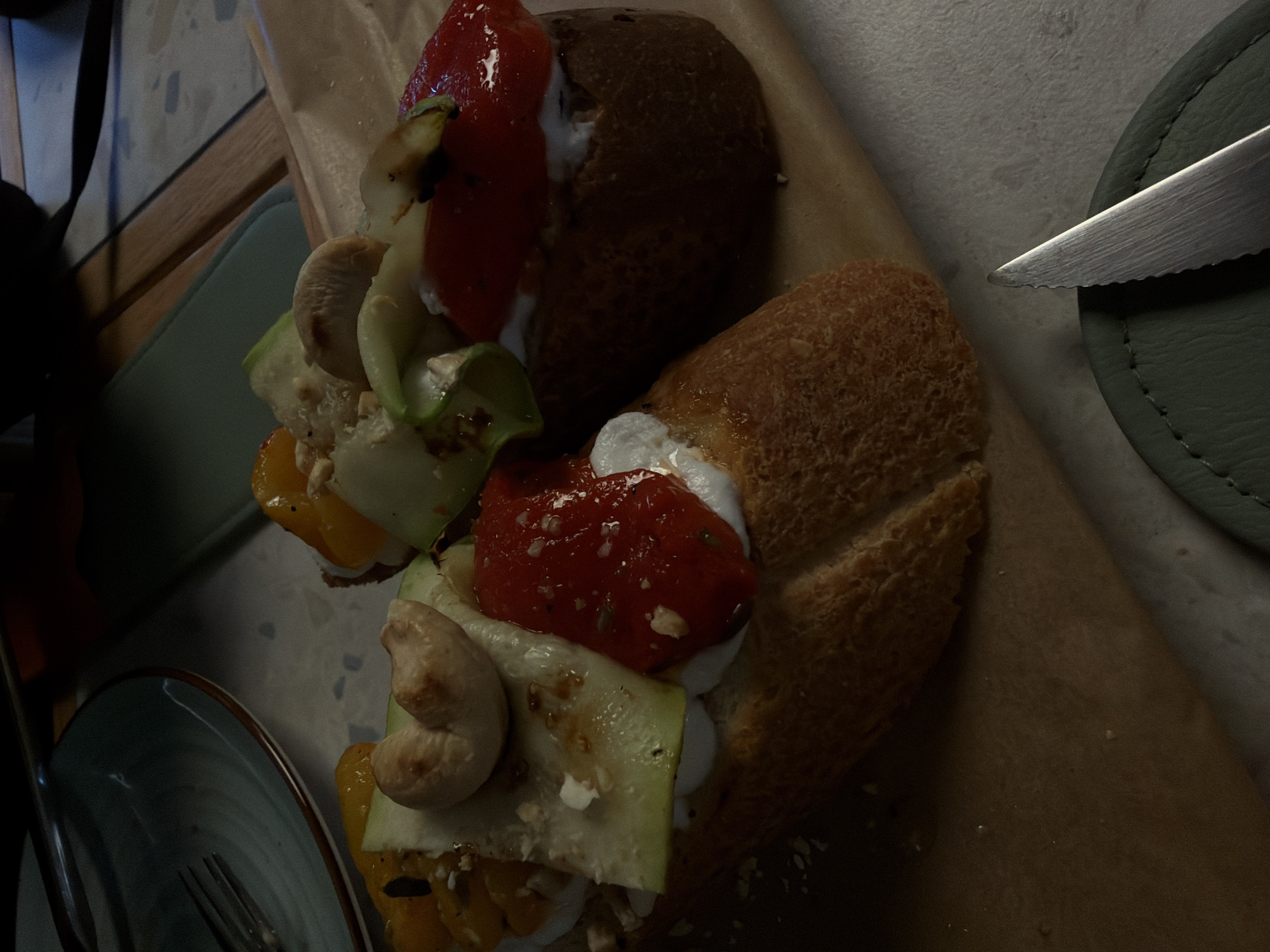 The image depicts a close-up shot of two halves of what appear to be open-faced sandwiches. The sandwiches are placed on a piece of brown paper, likely parchment or butcher paper. The main visible ingredients on the sandwiches consist of sliced vegetables including red peppers, zucchini, yellow bell peppers and what appear to be mushrooms. A white creamy substance, possibly a sauce or cheese, is also visible between the bread and vegetables. A knife is partially visible in the upper right corner, resting on a green circular mat. A portion of a blue plate and a fork are discernible in the lower left corner of the frame. It is not possible to confirm that the picture was taken in Yerevan, Armenia, from the image alone.