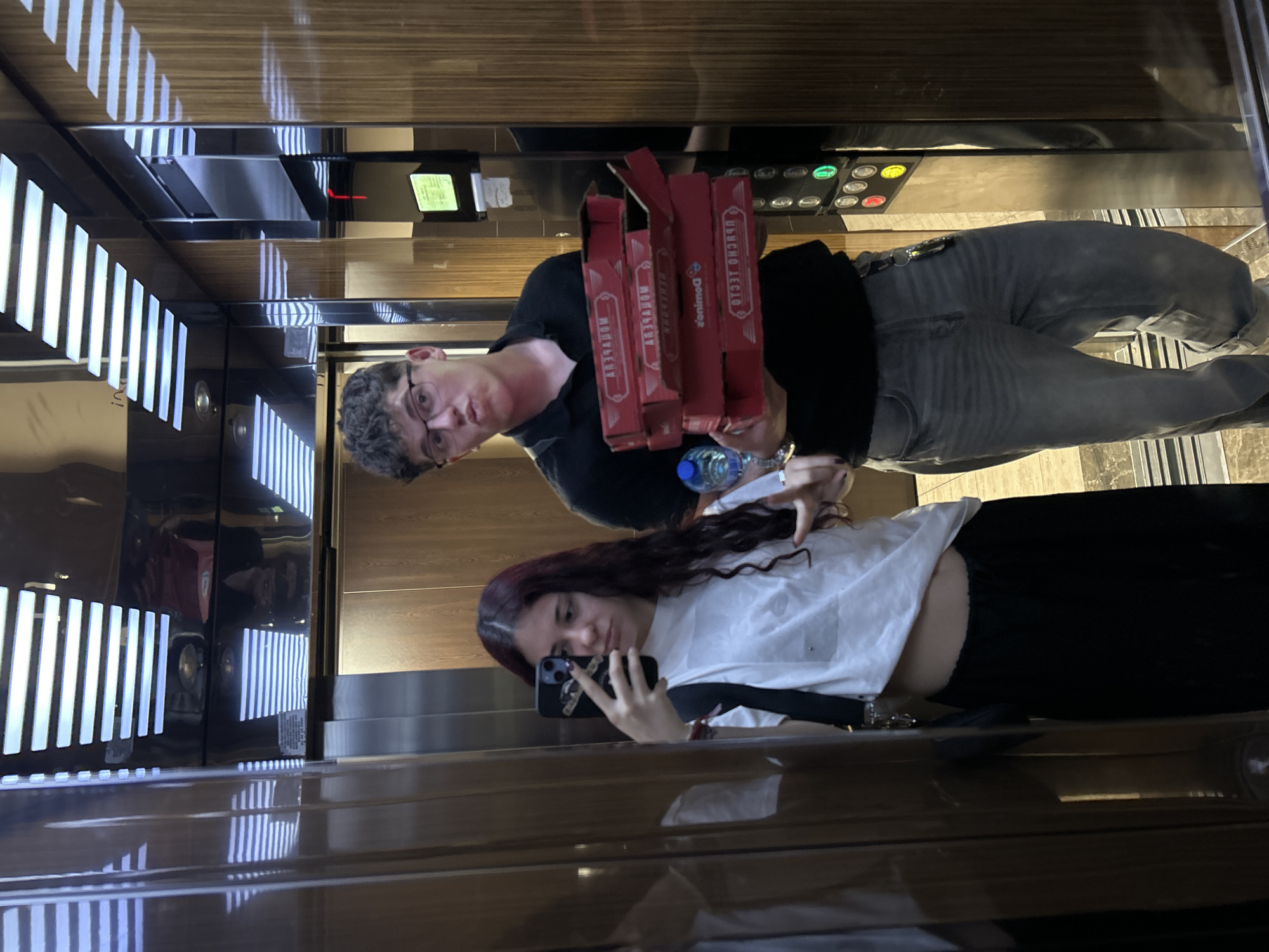A medium indoor shot, taken within an elevator, captures two young individuals taking a selfie
