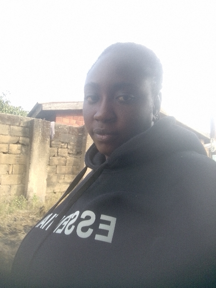 The image depicts an adult female with dark skin, positioned slightly off-center to the right, looking directly into the camera. She is wearing a dark-colored hooded sweatshirt with reversed white text visible on the chest, displaying "ESSE TI" (likely part of "ESSENTIAL"). A dark earring, possibly a stud or small hoop, is visible in her right ear. The background features a weathered, light-colored concrete block wall extending across the mid-ground to the left. Beyond the wall, sparse dry vegetation is present. In the upper left background, part of a building constructed with reddish-brown bricks and topped with a dark roof structure can be seen. The sky in the upper portion of the frame is overexposed, appearing bright white. The scene depicts a semi-urban or rural environment within the city of Jos, Nigeria.