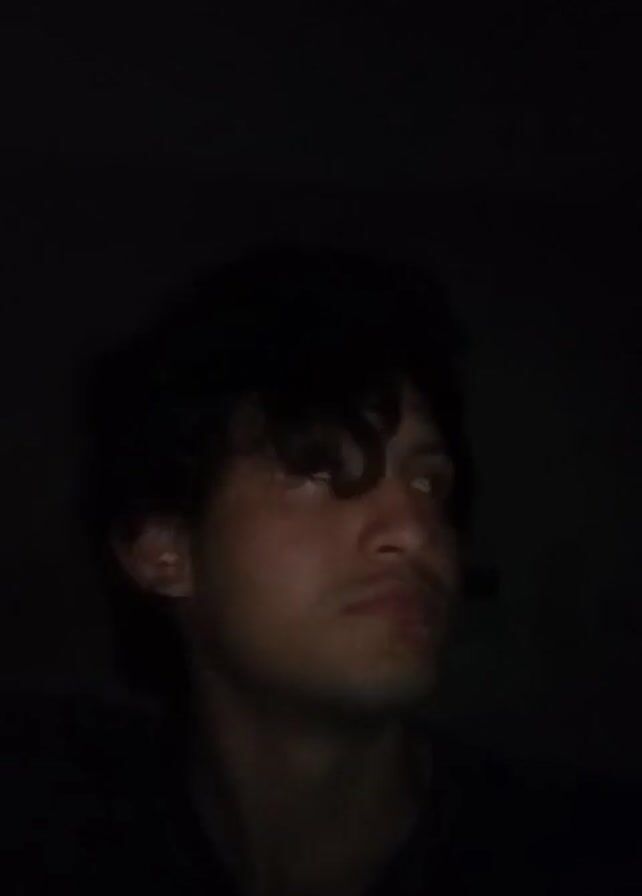 . The video shows a close-up of a person's face in very low lighting. The person appears to be a young adult with dark, curly hair. The person makes a fist and taps it on their forehead, near the left eye. The background is dark, making it difficult to discern details of the environment.