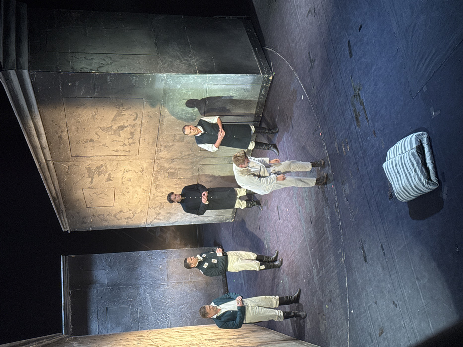 This image depicts a scene on a theatre stage in Mahilyow, Belarus. The set features three large, dark grey rectangular structures, constructed to resemble distressed stone or concrete walls, with recessed panels. Some panels display faint, bas-relief-like or painted imagery, including a discernible figure on horseback on the far right panel. The stage floor is dark blue/grey, exhibiting wear marks. The scene is illuminated by overhead and stage-right lighting, casting pronounced shadows. Five adult males are present on the stage. In the foreground, one male, dressed in a light grey two-piece outfit resembling a jumpsuit, stands bent forward with his head down and hands near his knees. On the stage floor, to his left, lies a light grey and white striped object resembling a rolled sleeping bag or duvet. Four other males stand in the mid-ground, positioned in a loose semi-circle behind and around the foreground figure. From left to right: 1. A male wearing a dark teal jacket, white collared shirt, light beige trousers, and dark tall boots. 2. A male wearing a dark jacket with light-colored patches, a white collared shirt, light beige trousers, and dark tall boots, holding a small white rectangular object in his right hand. 3. A male wearing a long dark coat, light beige trousers, and dark low boots, with dark, curly hair. 4. A male wearing a dark vest over a white collared shirt, light beige trousers, and dark tall boots. All five individuals appear stationary. The four mid-ground figures are oriented towards the foreground figure, who is bowed. The background behind the set structures is unlit and dark. No direct interactions or expressions are overtly visible.