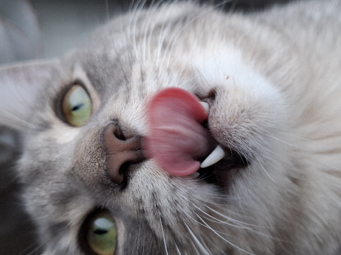 A close-up photograph taken in Novi Sad, Serbia, depicts the head and upper chest of a domestic cat. The subject features grey and white fur with visible whiskers. Its prominent green eyes show slightly dilated pupils. The cat's pink, textured tongue is extended upwards, performing a licking motion, partially obscuring the brown nose and exposing two sharp, white upper canine teeth. The background is uniformly blurred and light-toned, indicating a shallow depth of field and offering no discernible environmental details. No other subjects or objects are present.