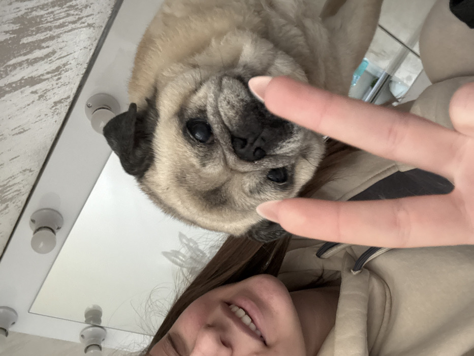 The image displays an indoor scene featuring a young female and a pug dog. The female, visible from the left side of her face to her upper chest, possesses long dark hair and wears a light beige hooded sweatshirt. Her mouth is slightly open in a subtle smile. Her left hand is prominently featured in the foreground, forming a "peace sign" with extended index and middle fingers, both featuring long, light-colored manicured nails. A fawn-colored pug with a black muzzle and dark eyes is positioned to the right, its head tilted, looking towards the viewer. The background consists of a white-framed mirror with multiple spherical, opaque light bulbs mounted along its top edge, suggesting a vanity setup. Reflections resembling decorative butterflies are faintly visible in the upper left portion of the mirror. Above the mirror, a textured wall with a light gray or off-white base and darker patterns is present. The lower right background reveals a light-colored tiled floor and indistinct items on a surface. The image provides no visual information to ascertain the precise location within Cherven Bryag, Bulgaria.