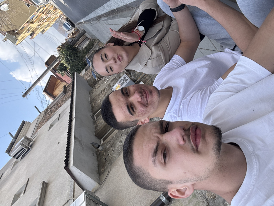 Three young adults are captured in a low-angle group photograph on an urban street in Shumen, Bulgaria