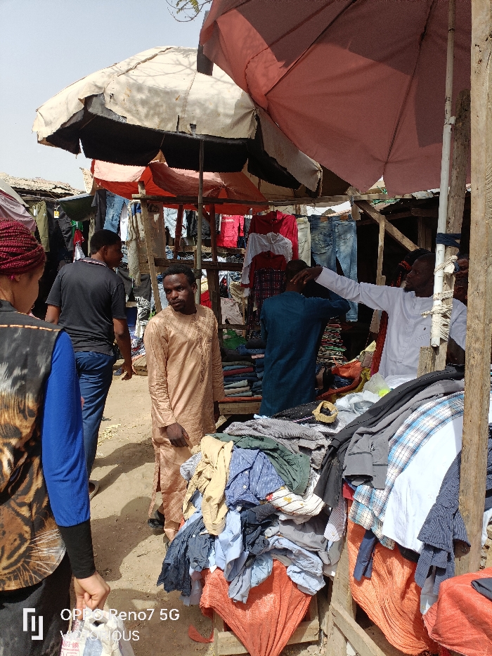 This image depicts an outdoor market scene in Fagge D1, Nigeria, under bright daylight with visible shadows