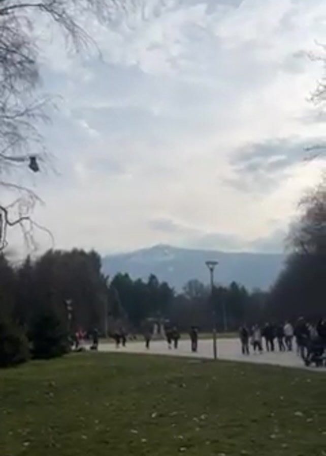 A wide shot shows a large public park on a cloudy day, with a line of people walking along a paved path. In the background, a large mountain range is visible, some of the peaks covered in snow. The foreground consists of a green lawn, scattered with fallen leaves, and trees with bare branches framing the shot on either side. Lamp posts line the path. The sun is visible through the branches of the trees. Some people are pushing strollers.