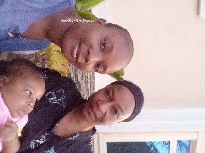 The image displays three individuals—two adult females and one infant—situated in what appears to be a residential outdoor or semi-outdoor environment