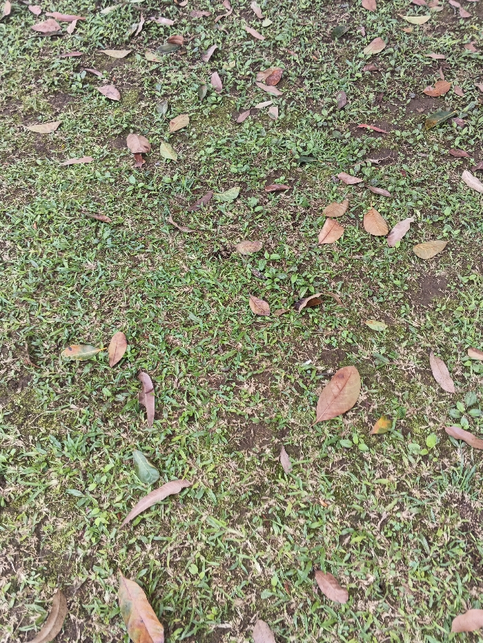 The scene depicts an outdoor ground surface in Palayan, Philippines, observed from a downward perspective. The ground is primarily covered by a patchy, low-cut lawn of green grass, with significant areas of dark brown soil visible between the grass clumps. Numerous fallen leaves are scattered randomly across the entire visible surface. These leaves vary in color, predominantly displaying shades of reddish-brown and light brown, with some exhibiting yellowish-green or faded green tones. Their shapes are generally oval to lanceolate. No individuals, animals, artificial objects, or specific actions are present or discernible within the frame. The scene is illuminated by uniform ambient daylight.