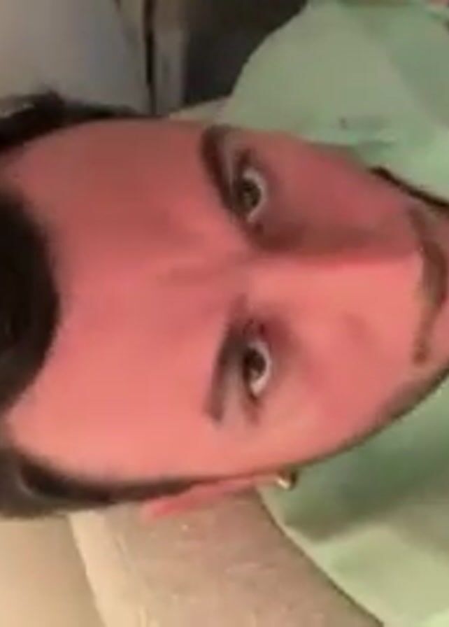 A man is recording a video from a low angle, so that his face fills the frame. He wears a light green collared shirt and has a mustache. He is mouthing the words to a song that is playing in the background, and at one point he pulls at the collar of his shirt. The environment appears to be indoors near a wall.