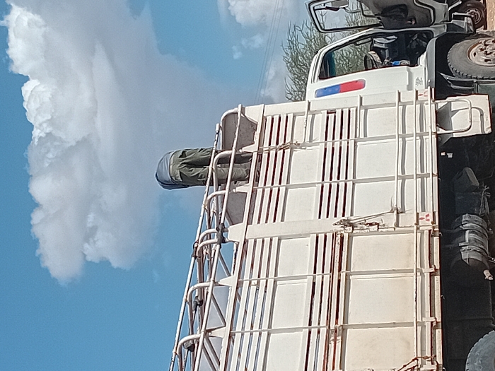 A white truck with a slatted, caged bed is parked. A person is wearing khaki pants and seems to be inside the bed near the top. The truck cabin is visible. The sky is blue and partly cloudy. The image is rotated ninety degrees clockwise.