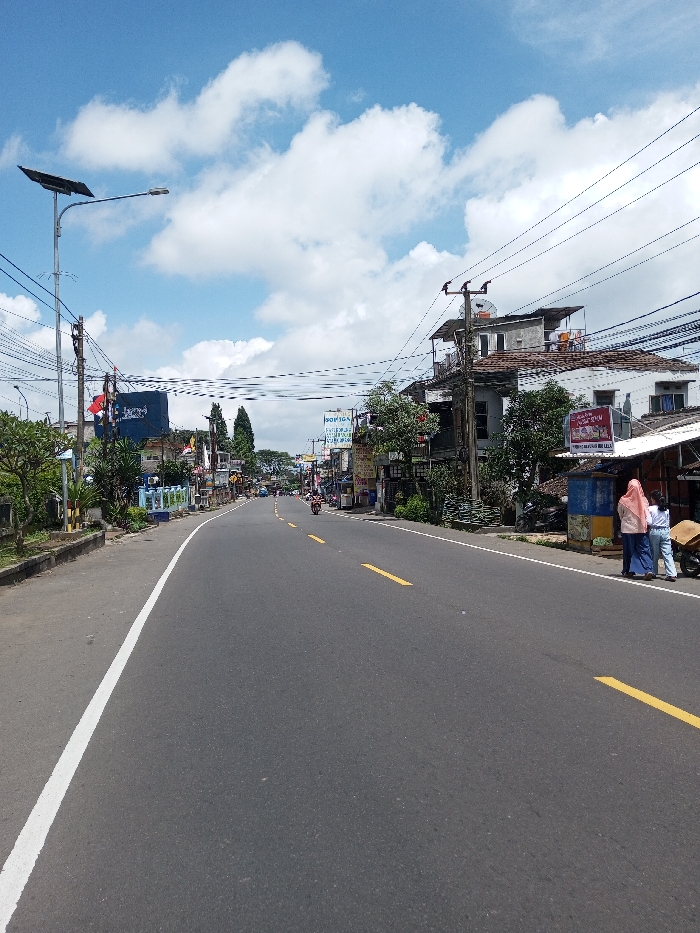 The image displays an urban street scene in the city of Boommlog, Bhutan, under a clear blue sky with scattered white cumulus clouds. A dark asphalt road, marked with a continuous white line on its left edge and intermittent yellow dashed lines for the center, curves gently to the left in the distance. On the left side of the road, a raised sidewalk or median contains green vegetation, low shrubs, and a tall metal pole supporting a solar-powered street light. Multiple utility poles with a dense network of overhead wires run along this side. On the right side of the road, a continuous line of multi-story buildings, appearing to be a mix of commercial and residential structures, fronts the street. A complex array of electrical and communication wires spans across the road, connecting poles on both sides. Various commercial signs, some displaying non-English text and one partially visible as "SONGA," are affixed to the buildings. In the mid-ground on the right, three individuals stand on the sidewalk. An adult female, wearing a light pink head covering (hijab) and a long dress, stands next to another adult in a light blue top and trousers. A smaller individual stands between them. They are positioned near a small, open-fronted roadside stall. A scooter is parked nearby, adjacent to the individuals. Further down the road, a single motorcycle is observed in motion, traveling away from the viewer. The environment is characterized by urban infrastructure, buildings, and interspersed vegetation.