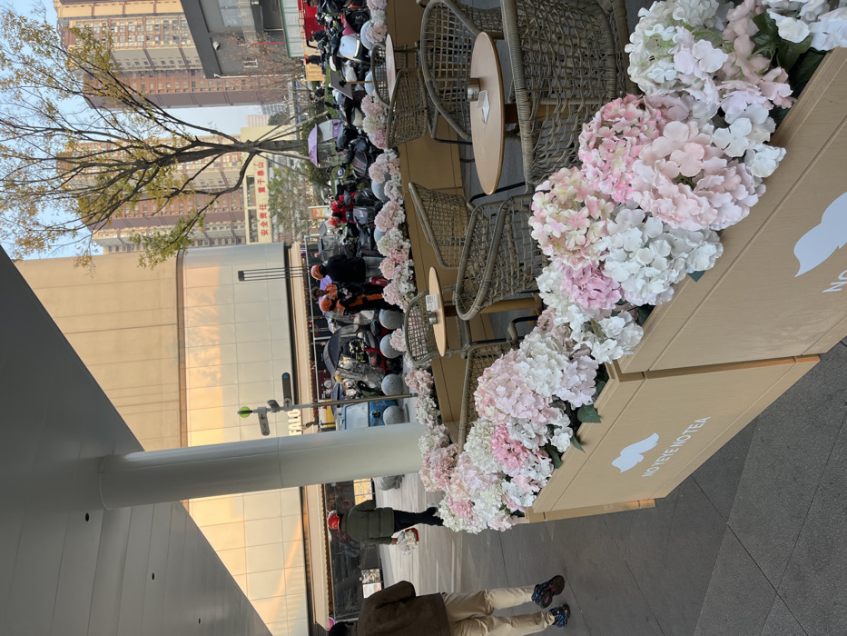 The image presents an outdoor urban scene in Wenjiang District, China, under warm, possibly late afternoon, lighting. In the foreground, a cafe's outdoor seating area is demarcated by a line of light-beige planters, each displaying a white stylized mustache logo and the English text "NO YEYE NO TEA". These planters are filled with dense clusters of artificial pink and white hydrangea flowers. Behind the planters are several round, light-colored tables accompanied by woven brown chairs, all unoccupied. To the left, a grey paved pedestrian walkway shows two individuals walking away from the viewer. The person closer to the foreground wears a brown jacket and light-colored trousers. The person ahead wears a green jacket, dark trousers, and carries a white bag. In the mid-ground, a modern building with a reflective glass facade reflects the warm light. A large white cylindrical pillar stands prominently in front of this building, supporting an overhead structure. A street signpost with multiple directional arrows and a green light is visible near the pillar. To the right, an extensive parking area is occupied by numerous electric scooters and three-wheeled delivery vehicles, some equipped with clear plastic rain covers. Several individuals, identifiable as delivery drivers by their orange jackets and red helmets, are gathered among these vehicles, appearing to be conversing or waiting. A banner with Chinese characters reading "安全责任 重于泰山" (Safety responsibility is heavier than Mount Tai) is visible on a distant building facade. A leafless deciduous tree stands between the vehicle parking area and the distant buildings. The background features multiple tall, multi-story residential buildings under a clear sky.