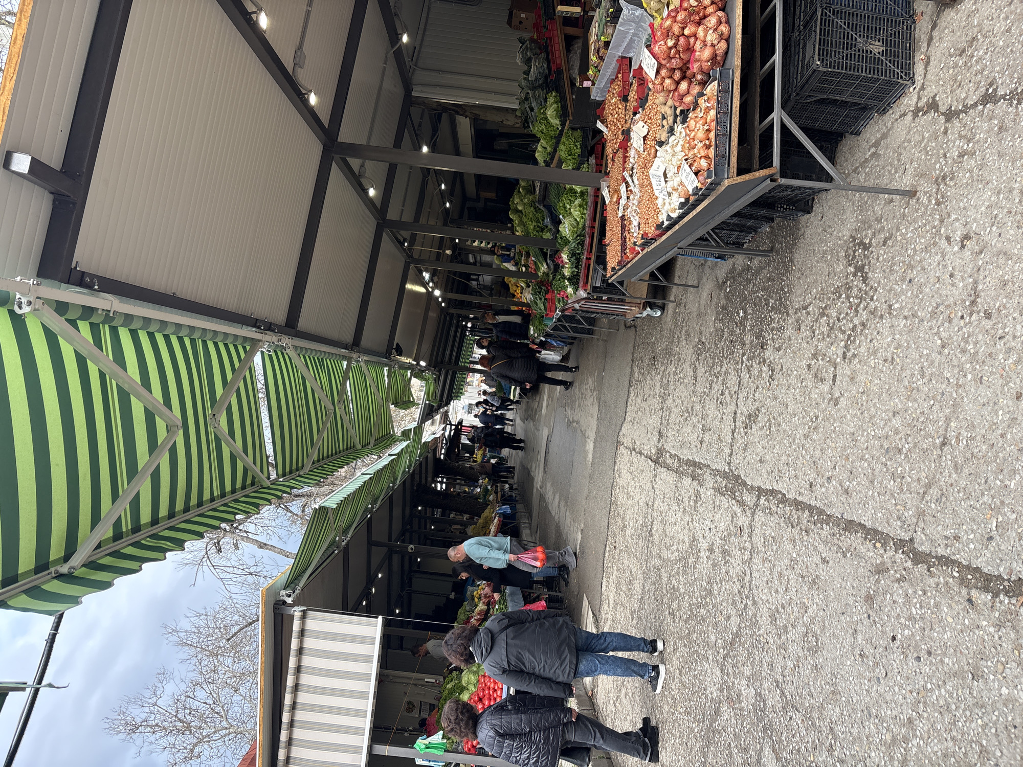 The image depicts a bustling scene at a marketplace located in Veliko Tarnovo, Bulgaria. A covered market structure, featuring green and white striped awnings, stretches into the distance. Vendors display a variety of fresh produce, including onions, garlic, lettuce, and other vegetables. Several people are shopping, browsing through the goods, and making purchases. The ground is concrete, showing signs of wear and use. The sky is overcast.