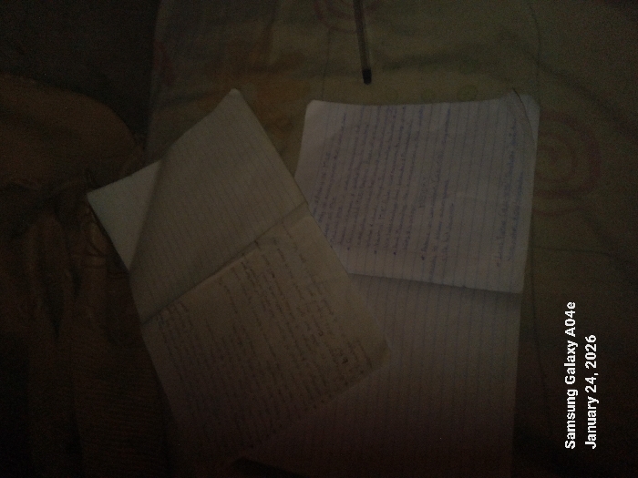 The scene is documented in the city of Origi, Nigeria. An overhead view captures an indoor setting under dim illumination. In the foreground and midground, two sets of lined paper are visible on a light-colored, patterned fabric surface. One item is an open notebook, displaying handwritten text in blue ink across both its exposed pages. To its right, partially overlapping, is a separate sheet of lined paper or a closed notebook, also bearing blue ink handwriting. A black-barreled ballpoint pen with a clear section is positioned horizontally to the right of these papers. No individuals are present. An embedded text overlay in the lower-left corner reads "Samsung Galaxy A04e January 24, 2026."