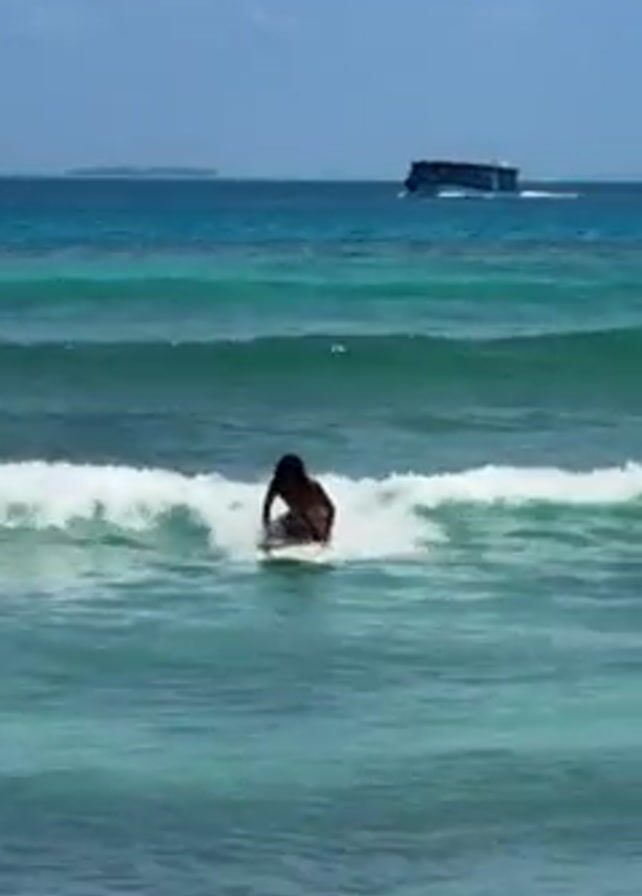 person surfing on a small wave in a turquoise sea. The person is dark-skinned with long, dark hair and is wearing dark swim trunks. They are initially lying on the surfboard, then push themselves up to a standing position. In the background, there is a boat moving across the horizon and a small island is visible. The sky is clear and blue.