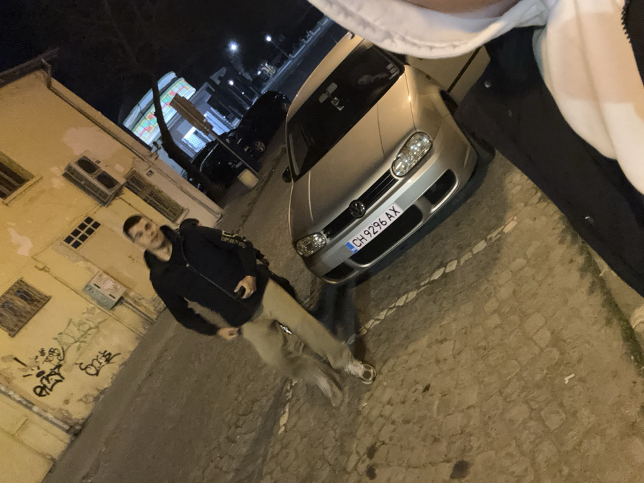 The image depicts an urban street scene at night in Yambol, Bulgaria. In the midground, a young adult male stands facing the camera, positioned to the left of a parked silver Volkswagen Golf Mk4. The male subject wears a dark zippered jacket with white text on the right sleeve, light-colored pants, and white sneakers with brown accents; his right hand is held near his waist. The Volkswagen Golf displays a Bulgarian license plate, "CH 9296 AX," confirming its origin. The ground surface is composed of cobblestone pavement. In the immediate foreground, to the right, a portion of a person wearing a white hoodie and a dark jacket is visible, indicating they are holding the camera. The background on the left features a two-story building with a weathered, light-colored (possibly yellow or beige) facade exhibiting peeling paint and black graffiti. This building has several windows, some of which are barred, along with an electrical utility box and an air conditioning unit mounted on its exterior. On the right side of the background, further down the street, another building with distinctive multi-colored, illuminated window panels is visible, alongside additional parked vehicles and a tree with bare branches. The scene is illuminated by artificial street lighting.