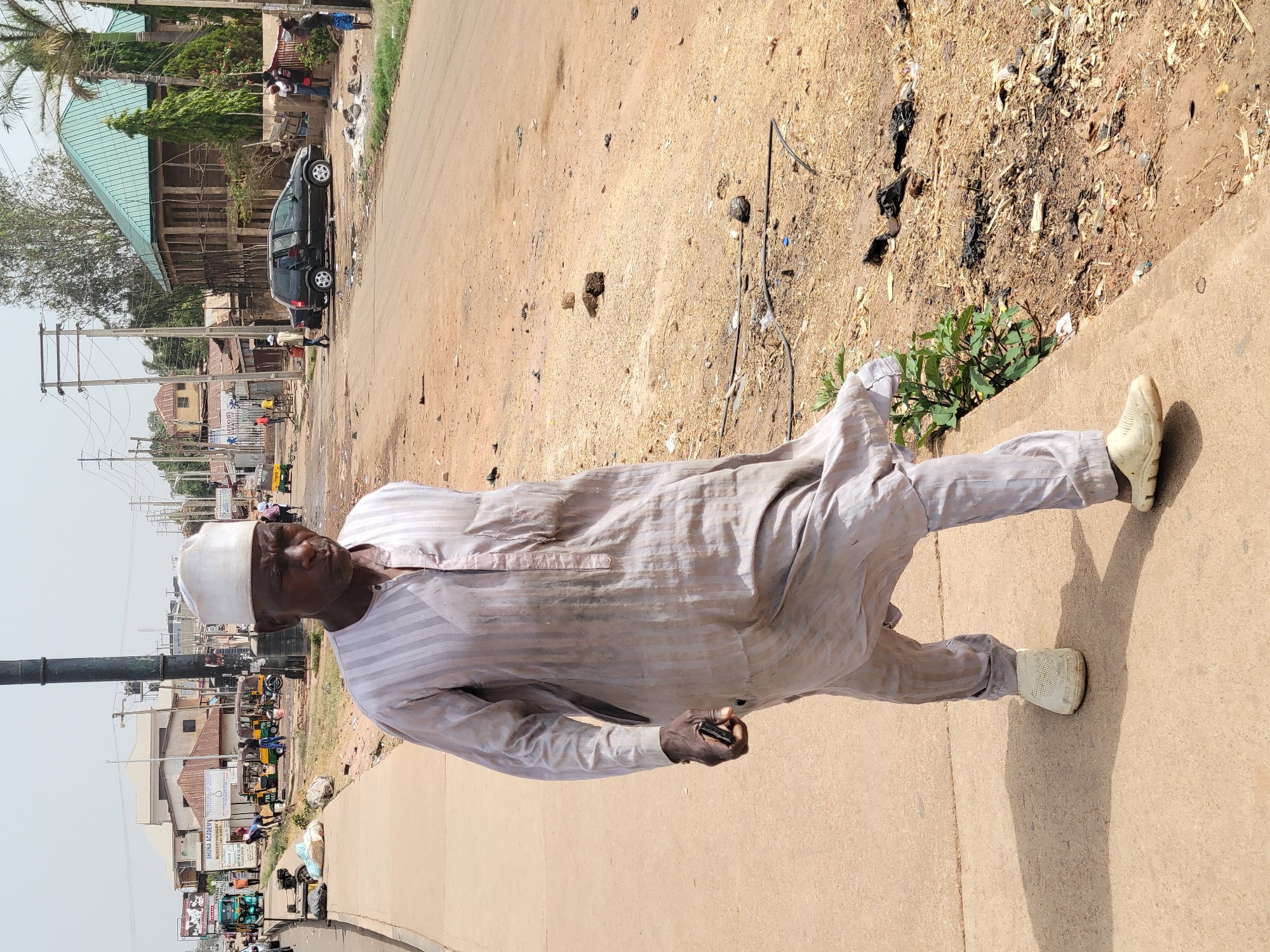 A man stands on a sidewalk in Jos, Nigeria. He wears a light-colored striped outfit and a white cap. He is holding a dark object, possibly a phone. The background shows a street with vehicles and buildings under a bright sky. To his right is an unpaved roadside area with some trash.
