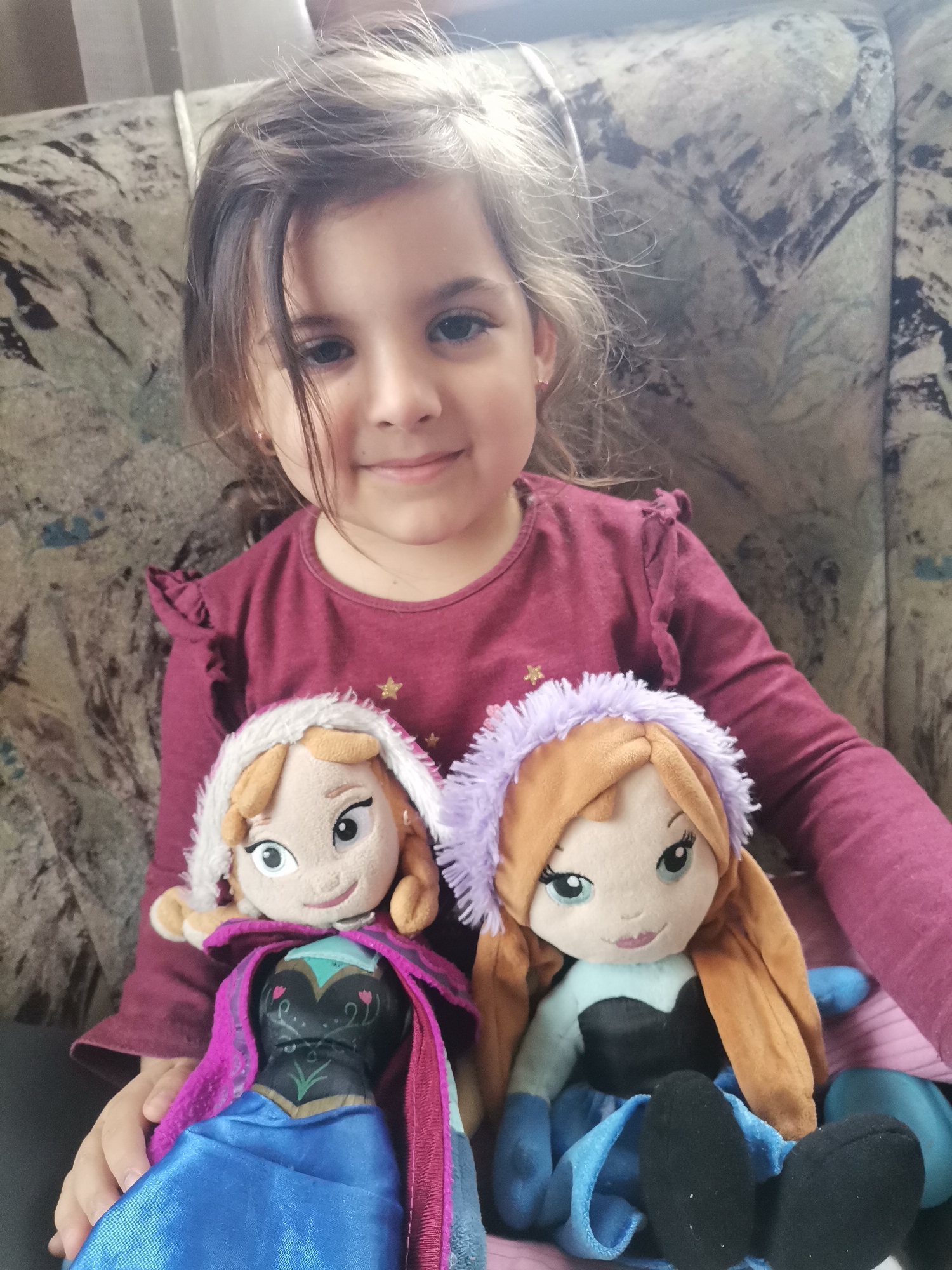 A young girl sits on a floral-patterned sofa, cradling two Frozen dolls: Anna and Elsa. The girl has brown hair and is wearing a maroon, long-sleeved shirt adorned with star designs. The Anna doll is on the left, featuring a cream hood, magenta cape, a black and teal bodice, and a blue skirt. The Elsa doll, on the right, has a lavender hood, orange hair, a blue and black bodice, and a blue skirt. There is no explicit information to confirm that this photo was taken in Obrochishte, Bulgaria. The location is inferred.