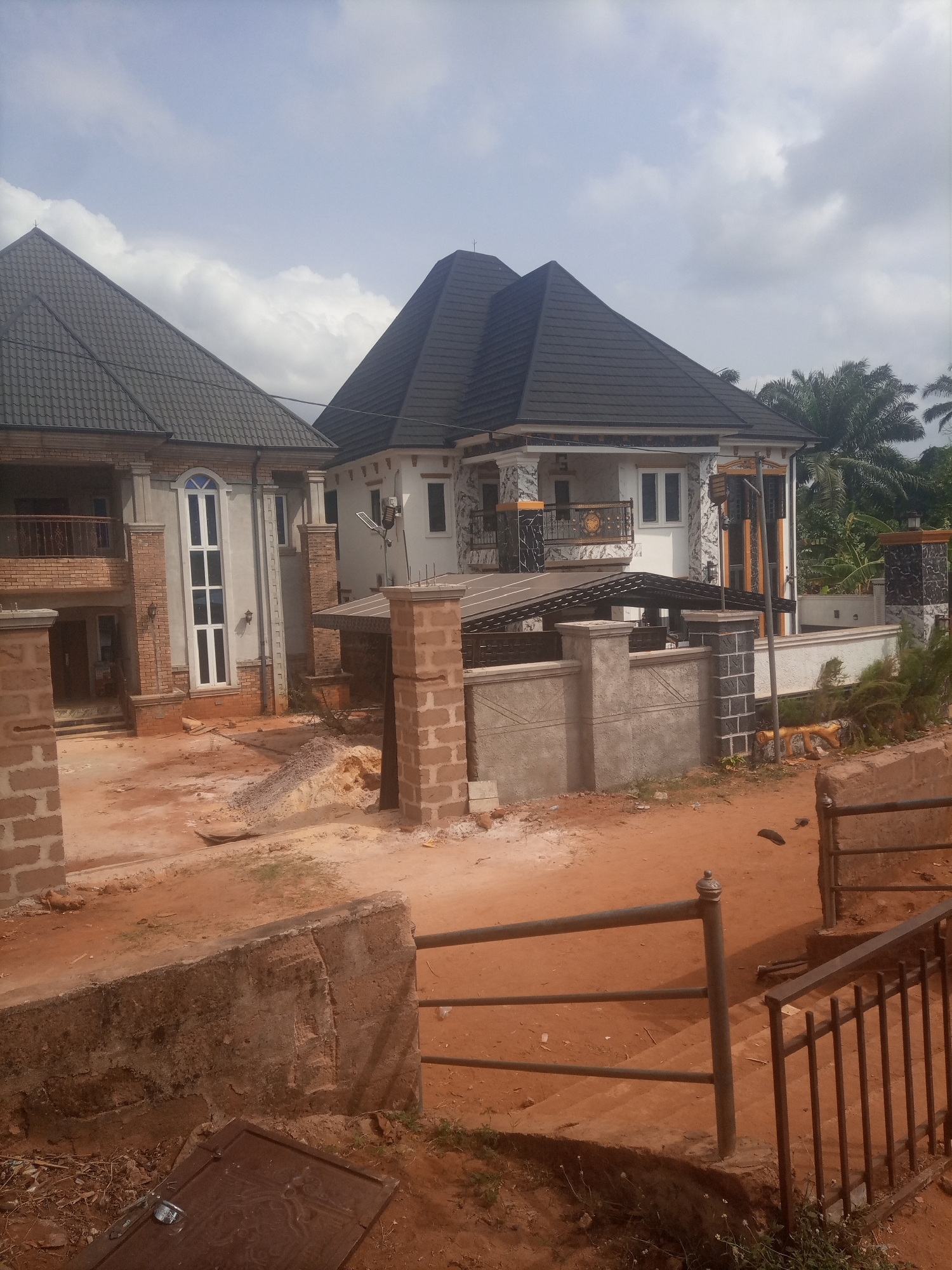 The image depicts a construction site or recently completed residential area in the city of Unknown, Unknown, under a partly cloudy sky. In the foreground, a reddish-brown dirt path occupies the lower half of the frame, showing signs of vehicle tracks and uneven terrain. To the immediate bottom left, a dark brown square metal plate with a padlock rests on the dirt. A low, unfinished concrete retaining wall runs across the bottom left. To the right, a dark metal handrail system, comprising vertical bars and horizontal rails, is visible, suggesting a set of stairs or a sloped access point. The midground features a prominent area of disturbed reddish-brown soil, indicative of ongoing construction or landscaping. Two partially constructed pillars made of red brick are positioned centrally, flanking a dirt area. Behind these, a grey concrete wall with black and white accents is visible, part of a perimeter fence. A temporary, black-roofed structure, possibly a carport or shelter, stands between the two main buildings. The background showcases two multi-story residential buildings. The building on the left is primarily grey concrete with exposed red brick details and a prominent tall, arched window with white frames. It has a dark grey pyramidal roof. A balcony with an ornate dark railing is visible on its upper floor. The building on the right is more developed, featuring white walls, black and white marble-like cladding, and ornate black and gold balcony railings. It also has a dark grey pyramidal roof. An external antenna is mounted on its side. Behind the right building, several tall green palm trees and dense green foliage are visible, suggesting a tropical or subtropical environment. No individuals are present in the scene. The overall impression is one of active development in a suburban or exurban setting.