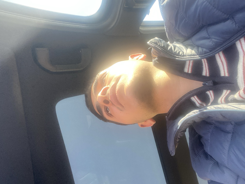 A man with short dark hair and light skin is looking up toward the sun. He is wearing a blue quilted jacket with red and white stripes along the zipper. The photo is taken from a low angle, showing the sunroof and interior of a vehicle. The bright sunlight creates a strong glare on his face.