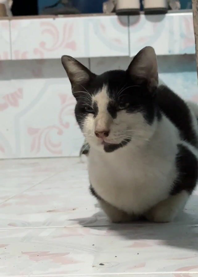 A medium shot captures a black and white cat sitting squarely on a tiled floor