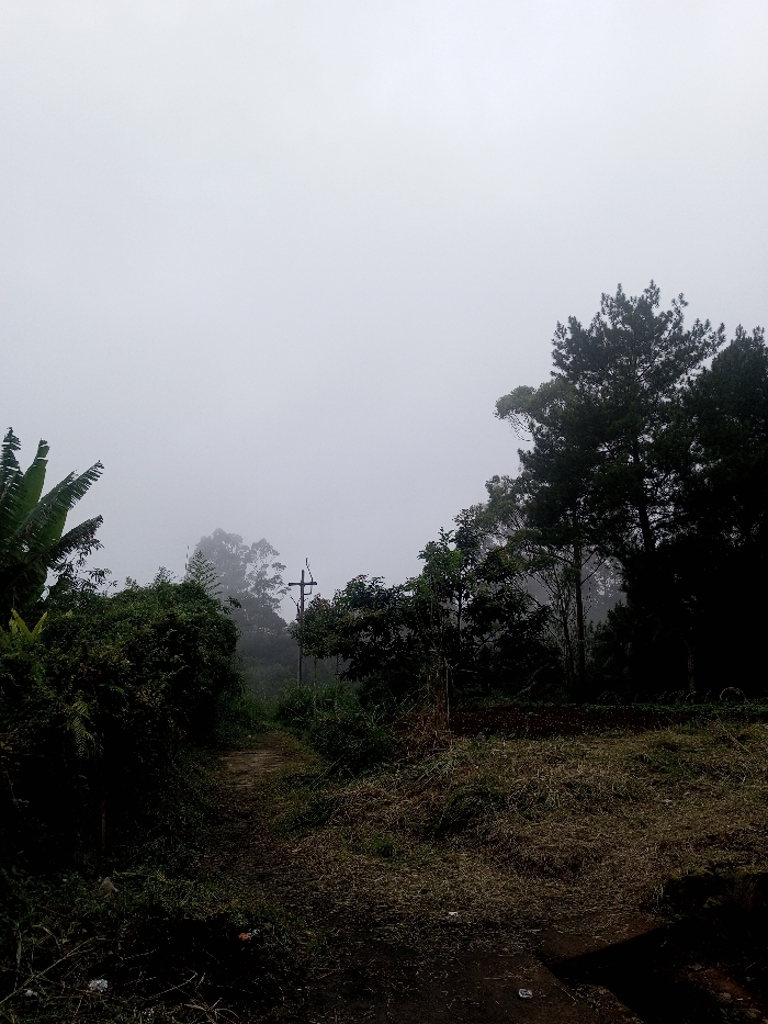 The image depicts a rural, heavily vegetated scene under overcast, foggy, or misty conditions in Irupalai, Sri Lanka