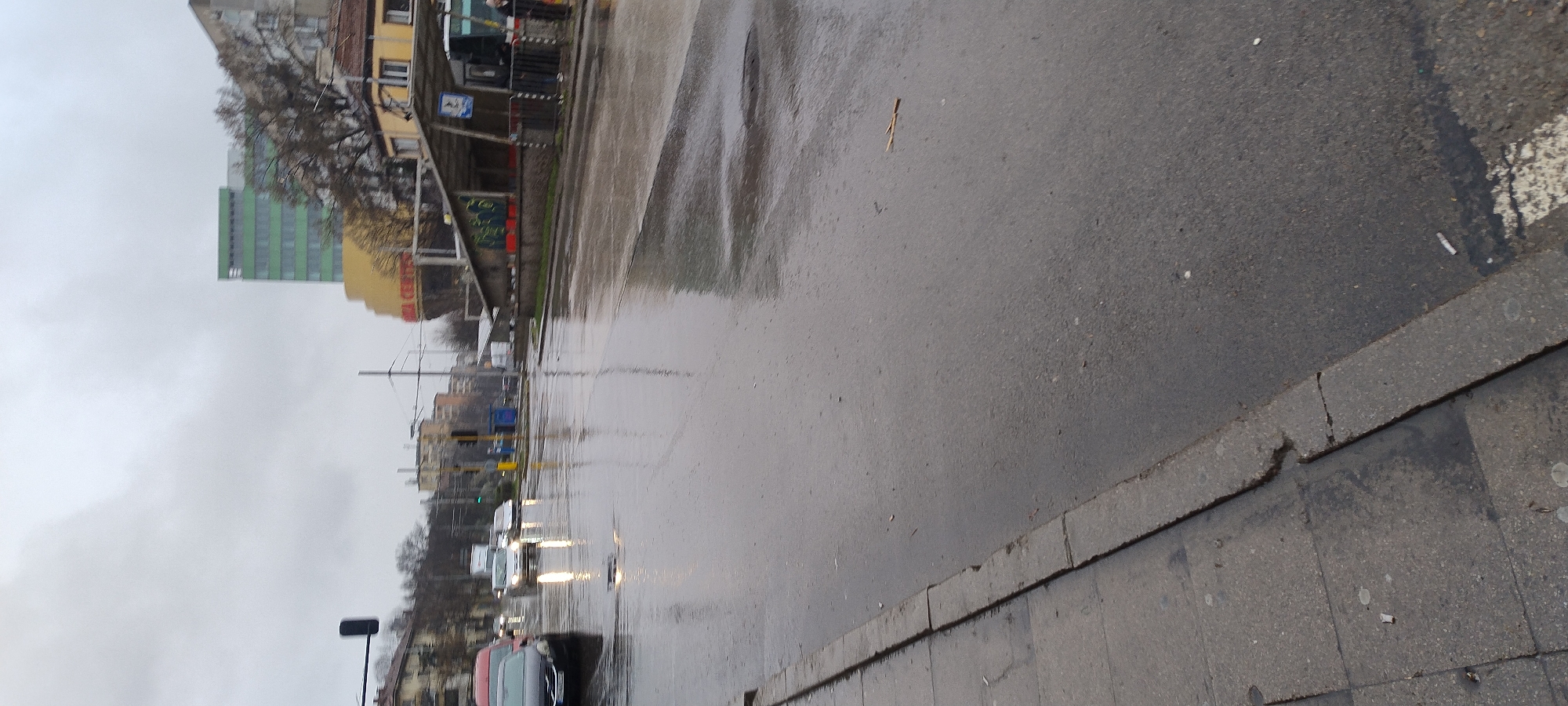 The image displays an urban street scene in the city of Unknown, Unknown, under an uniformly overcast, grey sky. The asphalt roadway is wet and highly reflective, indicating recent precipitation, with visible puddles and reflections of vehicle headlights. On the left, a grey concrete sidewalk with a worn curb, showing minor cracks and scattered debris including cigarette butts, runs parallel to the street. A dark sedan is stationary in the immediate left foreground, partially obscured by the frame, followed by a red minivan. Further down the multi-lane road, several indistinct vehicles with illuminated headlights are observed driving away from the viewer. A black traffic light signal arm extends from the left. On the right side of the road, a bus or tram stop shelter features a slanted, light-colored roof and concrete walls displaying red and green graffiti. A blue informational sign is attached to the shelter structure. A large, dark-colored bus or tram is parked at this stop, partially obscuring two individuals standing nearby, one of whom is a male visible from the waist up. In the background, an array of urban buildings includes a prominent yellow, tiered structure with partial red Cyrillic text "ГРИЛ ЦЕНТЪР" (Grill Center), and a multi-story building characterized by a distinct green facade. Bare deciduous trees are scattered throughout the background, suggesting a winter or late autumn season. Utility poles and overhead wires crisscross the midground and background.