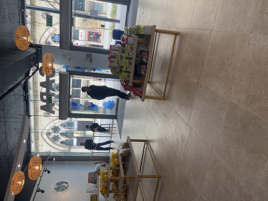 interior of a shop located at 53.794° N, -1.752° W in Bradford, UK. The shop is empty, with three men standing near a glass door. The men are wearing casual clothing. There is a display of boxed goods on a table near the center of the shop. The shop has a tiled floor and wood paneling on the walls. The display table is made of wood and has three tiers. The boxes are filled with various goods, including snacks, drinks, and other food items. The boxes are all brightly colored. The glass door leads to the outside, where there is a street and a building in the background. The building is made of stone and has a large glass window. There are several blue balloons floating above the doorway. There are also several hanging lamps. There are two large, hanging wicker-like lamps. There are two smaller, hanging lamps between the large lamps. There are several other, smaller lamps hanging in the background, not visible in the image. There is a sign above the doorway, partially obscured by the balloons. The shop has an open floor plan, and the walls are white. The floor is tiled in a light beige color. There is a small, rectangular table in the foreground. The table is empty and is made of wood. There are shelves on the left wall. The shelves are also empty. There is a cash register and other assorted items on the shelves. There is an open area, in the foreground, where there is an empty box on the floor. The image is taken from a low angle, looking up towards the ceiling. The image is in focus, and the colors are bright and clear.