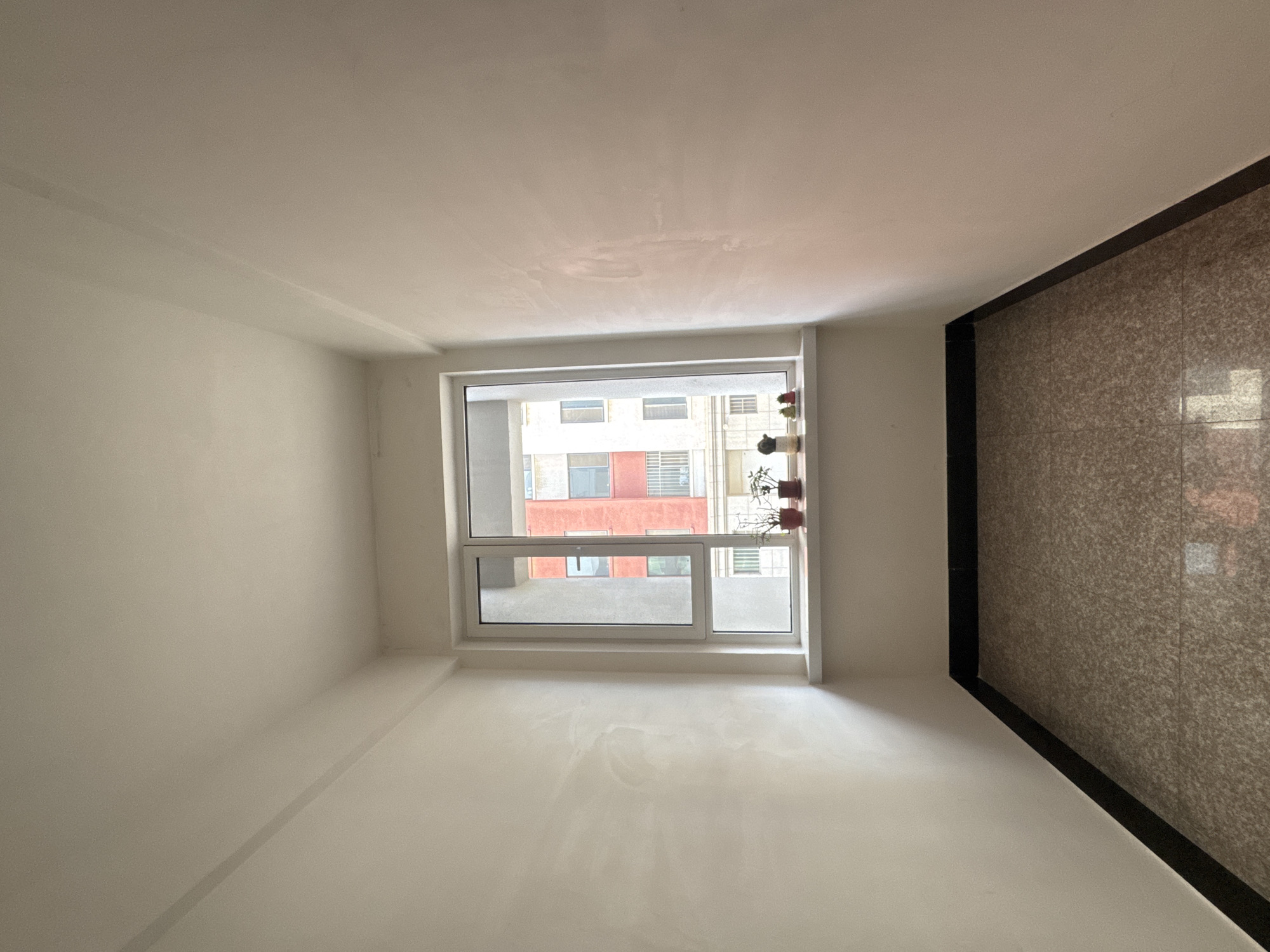 A sparsely furnished room in what is possibly an apartment located in Zhongtun, China, based on the building visible through the window. The room features white walls and ceiling, and a window with a white frame. Outside the window, another building with a red and white facade is visible. There are a couple of potted plants on the windowsill. The room has a textured wall panel on the right side, trimmed with a black frame. The room appears to be freshly painted or recently renovated. No people or other objects are visible.