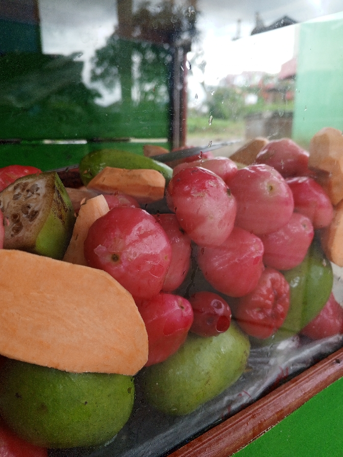 A close-up, eye-level view reveals an assortment of fresh fruits and root vegetables contained within a transparent display case exhibiting smudges and water droplets. The primary subjects are numerous reddish-pink, bell-shaped fruits. Interspersed among these are green, oblong fruits and multiple light orange, crescent-shaped slices. One green fruit, cut in half, displays a light-colored, fibrous interior with visible seeds. These items rest in a dark tray with a reddish-brown, wooden-textured rim along its lower edge. The blurred background, visible through the case, depicts outdoor scenery with green foliage, trees, and distant building structures under an overcast sky. The scene is located in Unknown, Unknown.