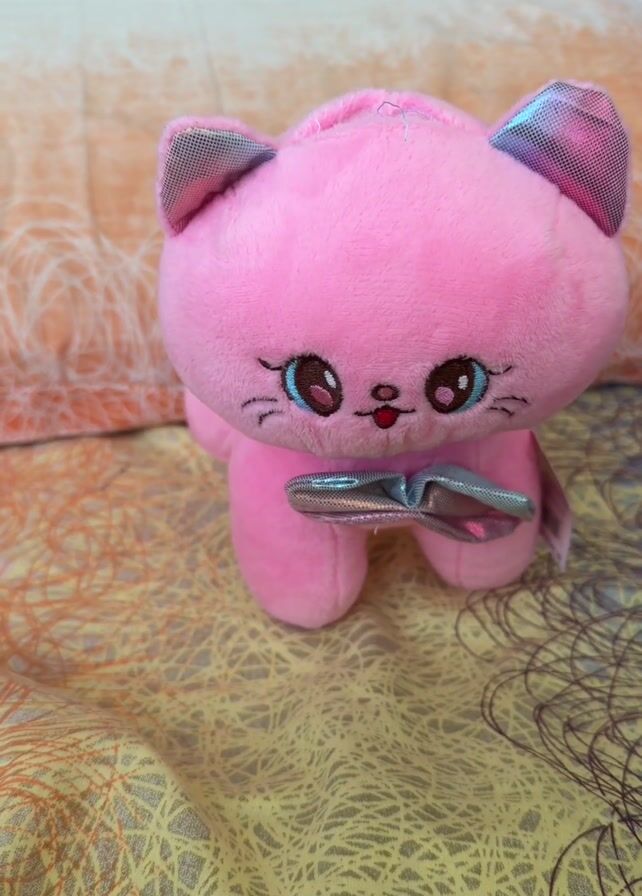 - "pink stuffed cat toy with a silver bow on a patterned bedspread" by FM-up5lz2, licensed under CC BY 4.0