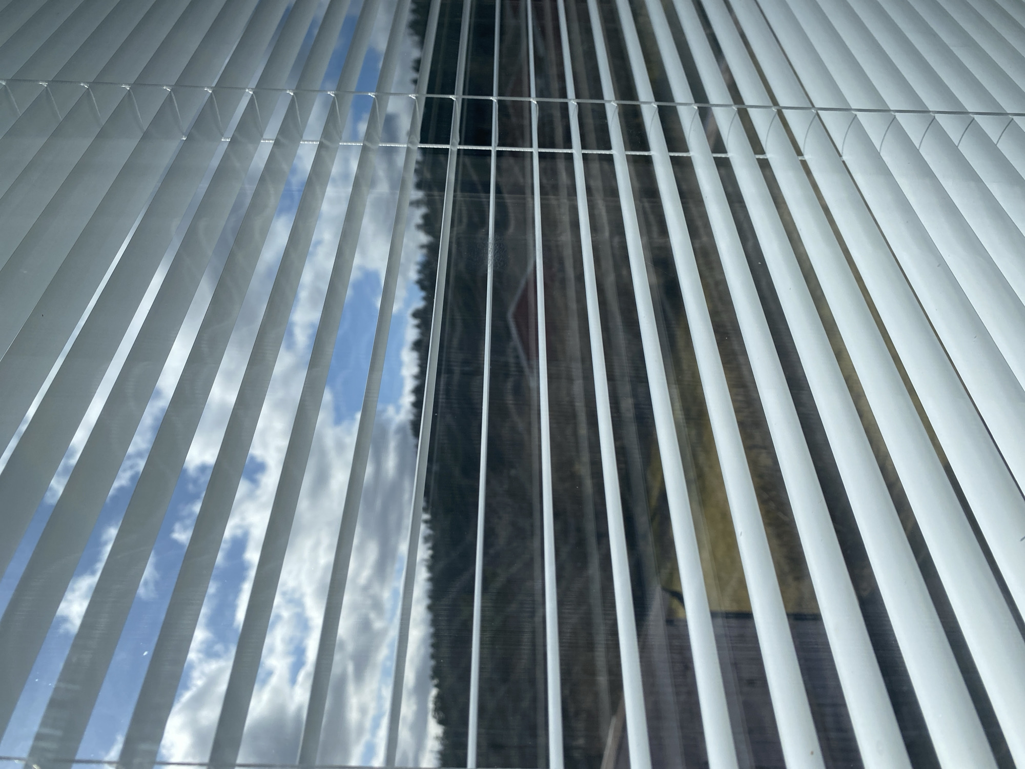 view through white window blinds. The view outside is partially obstructed by the blinds. On the left side of the frame, a view of blue sky with white clouds is visible. On the right side, dark trees and what appears to be a building can be seen. The location is Björklinge, Sweden.