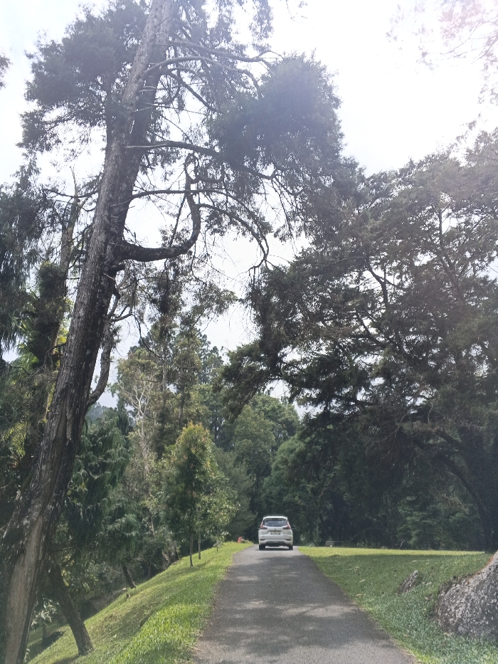 A car sits on an asphalt road, surrounded by a lush, green forest. Towering trees create a canopy overhead, their branches arching and intertwining. The scene evokes a sense of tranquility, with the road winding through the verdant landscape. The perspective is from a low angle, emphasizing the height and density of the surrounding foliage.
