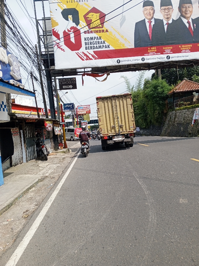 The image depicts an outdoor street scene within the city of Multhan, India. The foreground features an asphalt road with a solid white line marking its left edge, extending into the middle ground where fainter yellow road markings are visible. On the left, a worn concrete sidewalk abuts a series of low-rise commercial buildings with varied facades, including one with a blue and white checkered pattern on its lower section. A black motor scooter is parked on this sidewalk. Overlooking the street, a large billboard is prominently displayed, featuring the "GERINDRA" political party logo and text in red, along with portraits of three men identified as H. Amir Mahpuds, Sugiono, and H. Prabowo Subianto. Below the billboard, a black sign with white text reads "KEBUNRAYA CIBODAS" and "± 4 KM," pointing to the left. Numerous tangled utility wires crisscross overhead. In the middle ground, a light-colored container truck with a partially visible license plate ("B 9370") is proceeding away from the viewer. Directly behind the truck, a person wearing a helmet and dark clothing is riding a white and blue motor scooter. In the background, further vehicles are visible in traffic. The right side of the road features a rising, vegetated embankment with a stone wall and a small structure possessing a reddish-brown tiled roof, surrounded by green foliage, including bamboo stalks. The sky is overcast.
