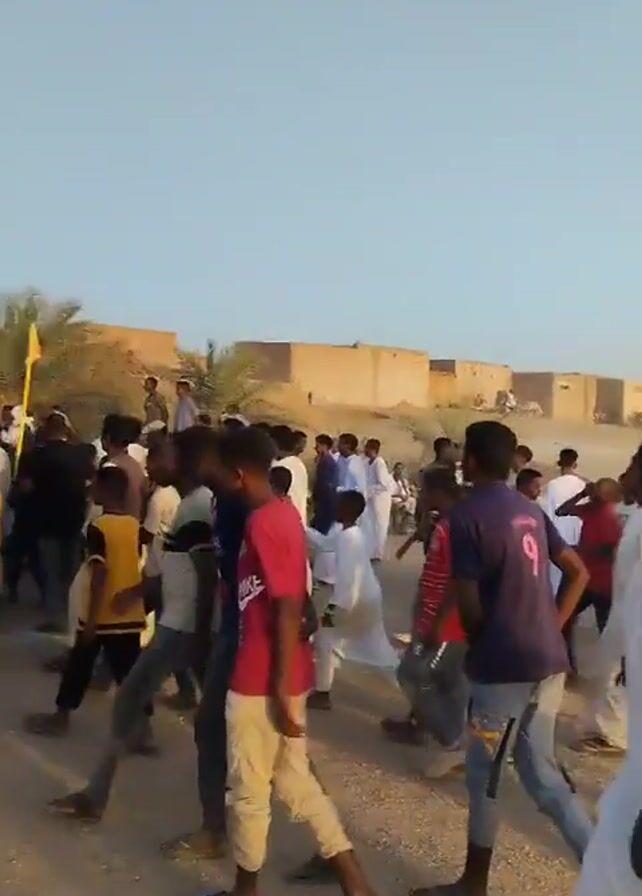 large group of people walking and milling around in an open, sandy area. Most of the people are young men, but there are people of different ages present. Some people are wearing traditional white robes, while others are wearing casual clothing like t-shirts and jeans. There is a yellow flag in the crowd. The background features low, mud-brick buildings and palm trees, suggesting a rural or desert environment. The sky is light blue and the light suggests it is either dawn or dusk. The general atmosphere seems lively and festive.
