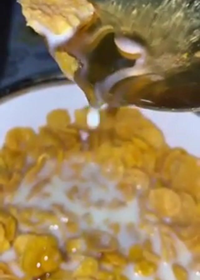A close-up shot shows a white bowl filled with cornflakes and milk