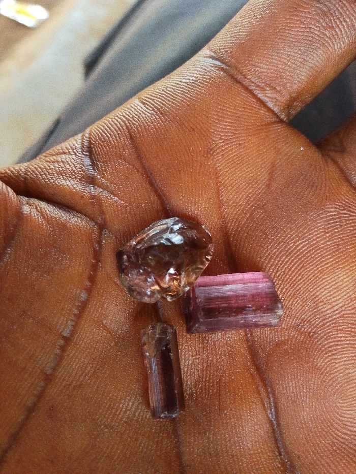 A dark-skinned human hand, palm open, displays three raw mineral specimens at Oduma Hill, Nigeria