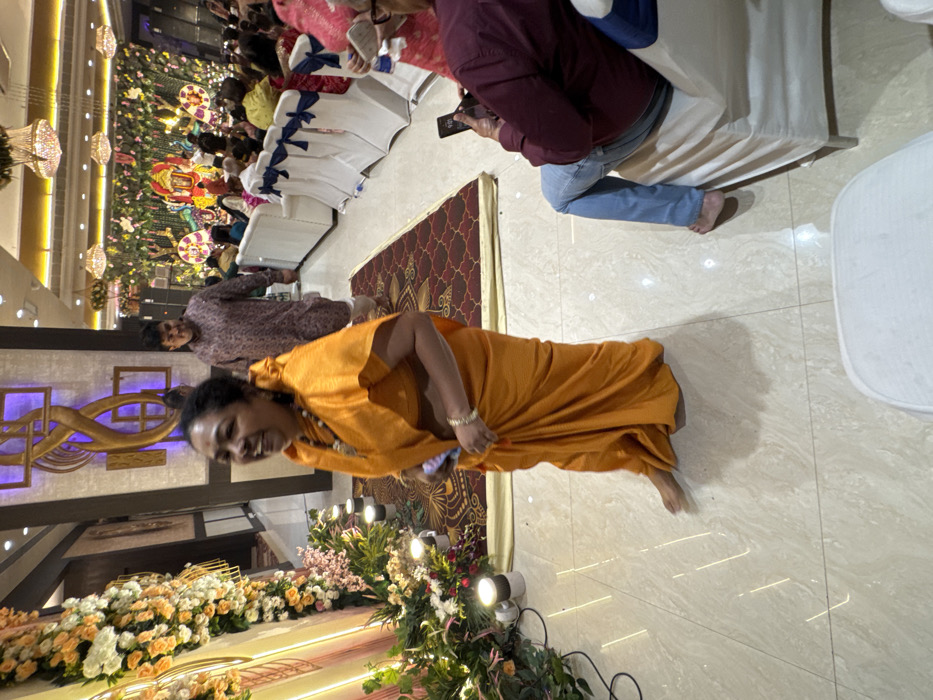 An event hall setting includes a woman in a bright orange sari standing near a flower arrangement. To the left, another individual in a patterned shirt is partially visible. Background displays tables with floral arrangements and chandeliers, along with people seated in white chairs. Another person, partially visible, is sitting in a white chair, wearing jeans and a maroon shirt and holding a phone.