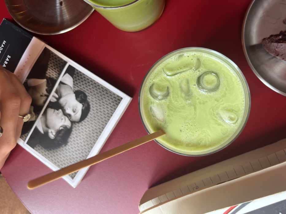 An overhead shot shows a red surface with a green iced drink with a straw in a glass. Near the drink, there is a book featuring a black and white photo of two people, and another glass containing more of the green liquid is situated behind and slightly to the left of the first one. A small plate with food is visible on the upper right. A notebook is partially visible in the lower right corner. A hand wearing a ring is visible on the left.