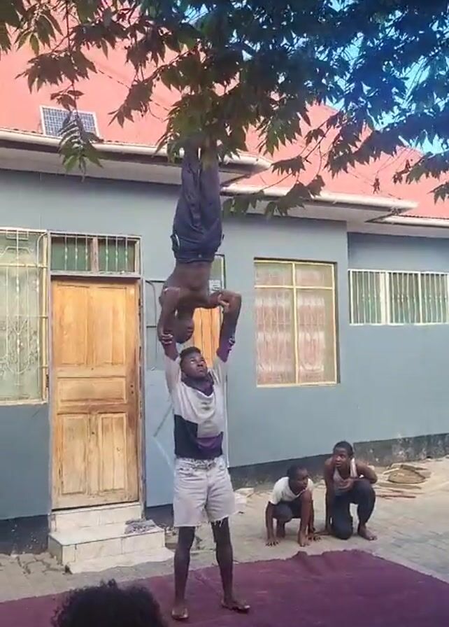 In an outdoor scene, a young man stands with his legs planted on a purple mat. He is wearing a white and grey long sleeve shirt and short grey shorts. He is holding the ankles of another young man, who is suspended upside down above him. The suspended man, shirtless, is performing a split while being held aloft. Two other children are kneeling behind the standing man. A small group of people is standing in front of the mat. A light grey building with a red roof, adorned with a solar panel, forms the backdrop. A tree with lush green leaves frames the scene above.