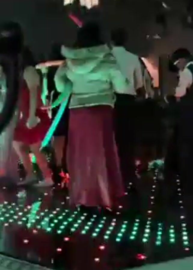 group of people dancing on a lighted dance floor at what appears to be a party or event. Most of the dancers are wearing formal or semi-formal attire. A woman in a pink skirt and light brown jacket is holding colorful balloon animals and dancing. Several young men in white shirts and dark pants are also dancing near her. The dance floor is black and reflective, with small lights embedded within it. The room has a high ceiling, decorative windows, and a lighting system that projects beams of light onto the dance floor. There are also speakers set up near the edge of the dance floor. The general atmosphere is celebratory.